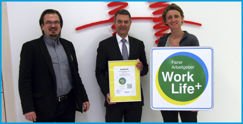 Stephan Handwerker and Rachel Hovington, directors of International School Hannover Region, are happy for their school to be awarded with the Work Life Plus seal as a fair employer by Sebastian Baacke (left).